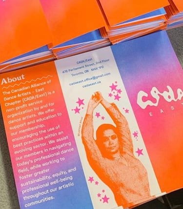 Brand Identity and a risograph brochure for CADA East(The Canadian Alliance of Dance Artists, East Chapter) which is a not-for-profit organization that supports and educates its membership of independent dance artists, promoting the use of best practices within an evolving sector. For this project, we created a logo that shows the movement of dance and has a flow to it.