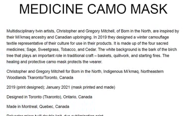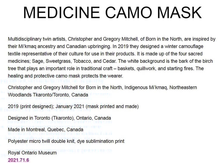 A face mask we designed with our custom camouflage pattern was featured in the 2021 exhibit “Clothing the Pandemic: An Exhibition of COVID-19 Face Masks from Around the World”.