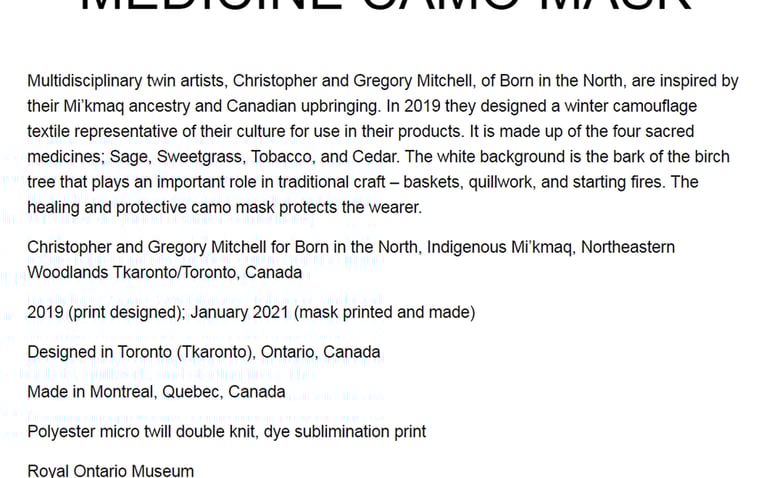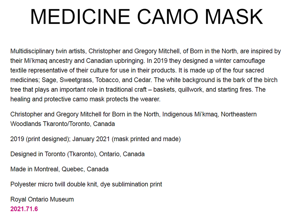 A face mask we designed with our custom camouflage pattern was featured in the 2021 exhibit “Clothing the Pandemic: An Exhibition of COVID-19 Face Masks from Around the World”.